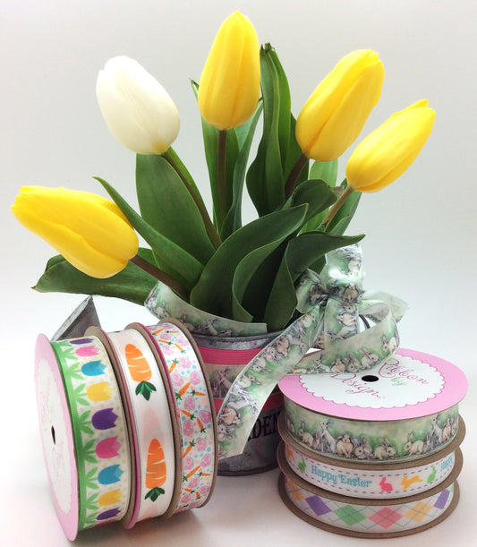 Tossed Eggs Ribbon on 5/8" White Satin Ribbon
