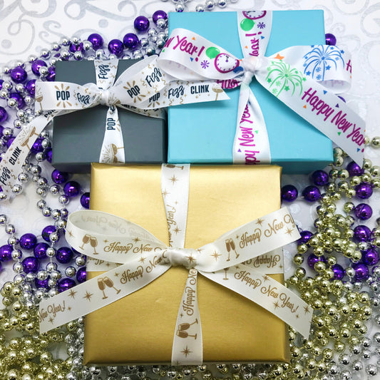 Happy New Year Ribbon in gold with Champagne glasses on 5/8" Antique white Single Face Satin ribbon