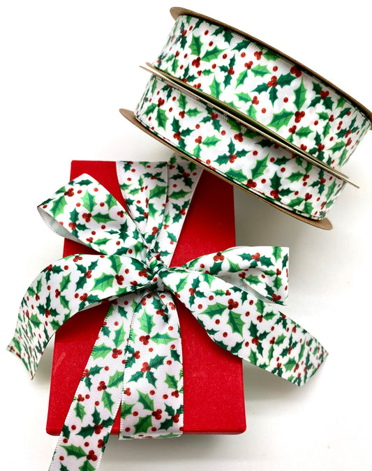 Holly and berries Ribbon in green with red berries on 7/8" White single face satin