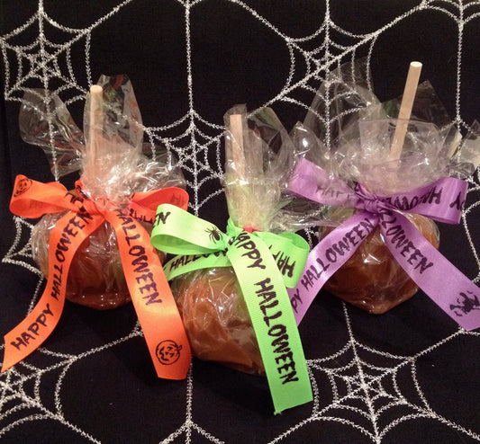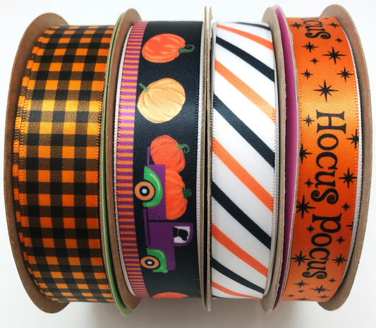 Happy Halloween Ribbon in black ink with a jack o'lantern on 7/8"Orange Single Face Satin ribbon