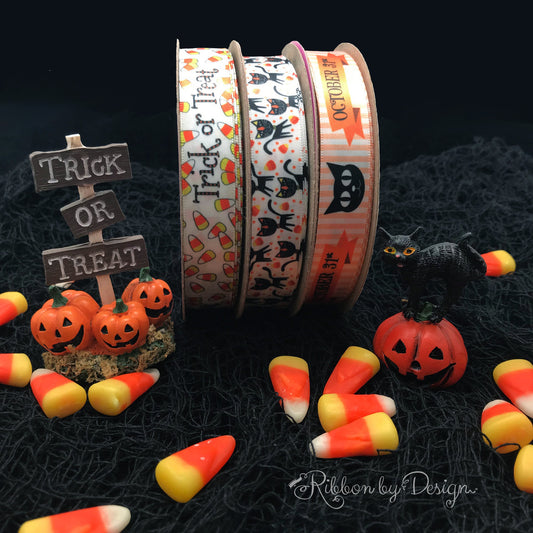 October 31st Ribbon with a cute black cat and orange stripes on 5/8" white single face satin