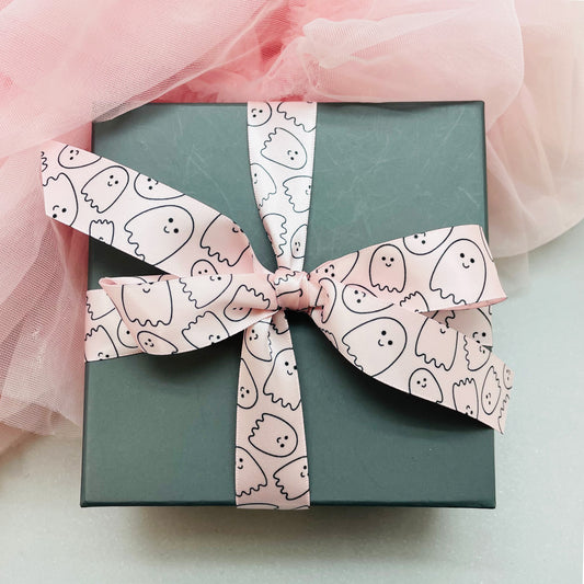 Ghost ribbon cute ghost with a happy smile outlined in black printed on 7/8" light pink satin