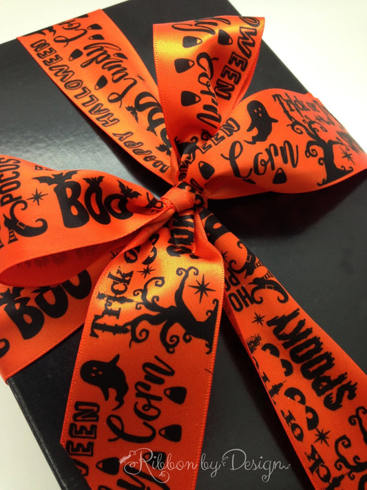 Halloween Word Block Ribbon black text with Halloween elements printed on 1.5" orange ribbon