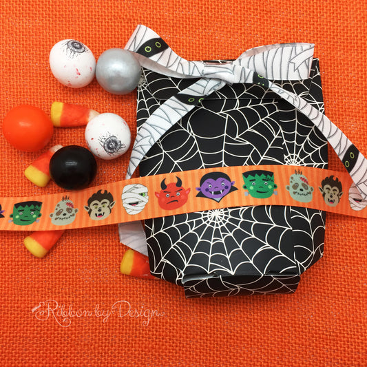 Monsters ribbon printed with an orange background on 7/8" white single face satin ribbon