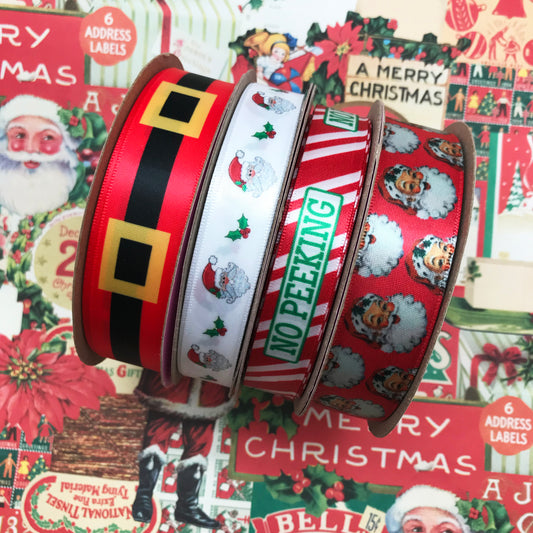 No Peeking! Christmas Ribbon in green with red and white stripes printed on 5/8" White SFS