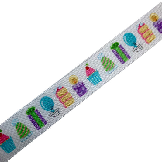 Birthday Party ribbon with cake, gifts, party hats and cupcakes printed on 5/8" white satin ribbon