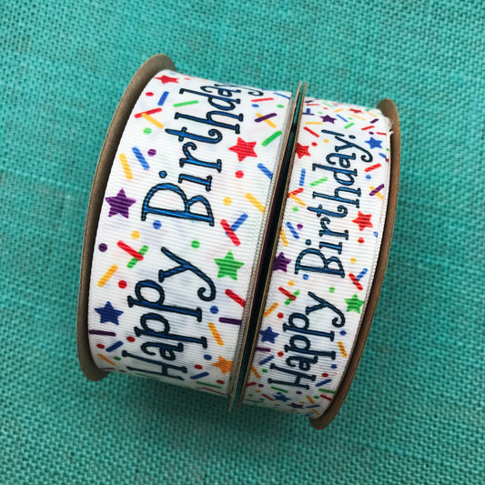 Happy Birthday Ribbon with Sprinkles in primary colors on 1.5" White Grosgrain