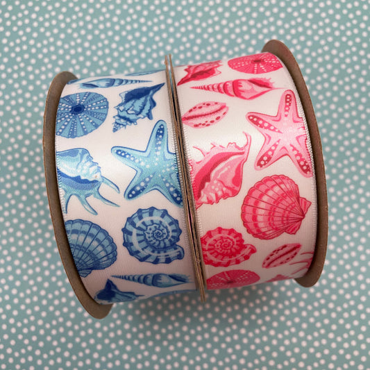 Seashell ribbon in pink for beach wedding, beach party, seaside party, gift wrap, quilting, party decor printed on 1.5" white satin