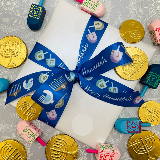 Hanukkah ribbon Happy Hanukkah with dreidels and menorahs on a blue background printed on 7/8" white single face satin