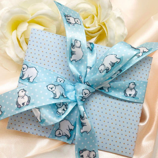 Polar Bear ribbon Polar bears on a blue and white dotted background printed on 7/8" white satin