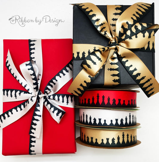 Chess ribbon with all the game pieces in black silhouette printed on 7/8" red satin