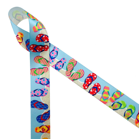 Flip Flop ribbon colorful flip flops in stripes, stars, and floral designs on a sand and blue background printed on 5/8" and 7/8" white single face satin