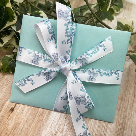 Baby Elephant ribbon with eucalyptus leaves printed on 5/8" white satin