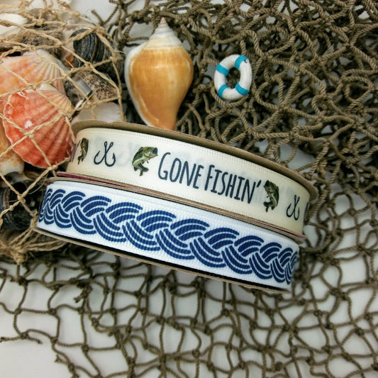 Gone Fishin' Ribbon printed on 5/8" antique white single face satin