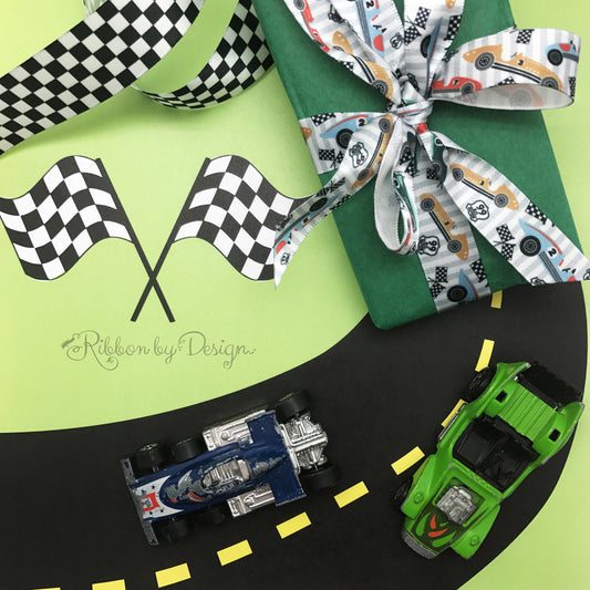 Vintage Race Car Ribbon with a striped background on 5/8" white single face satin