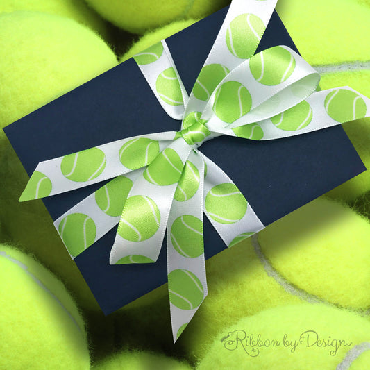 Tennis Ribbon green tennis balls bounce along on a white background printed on 5/8" single face satin