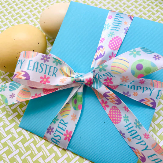 Easter Ribbon Happy Easter with eggs printed on 7/8" white satin