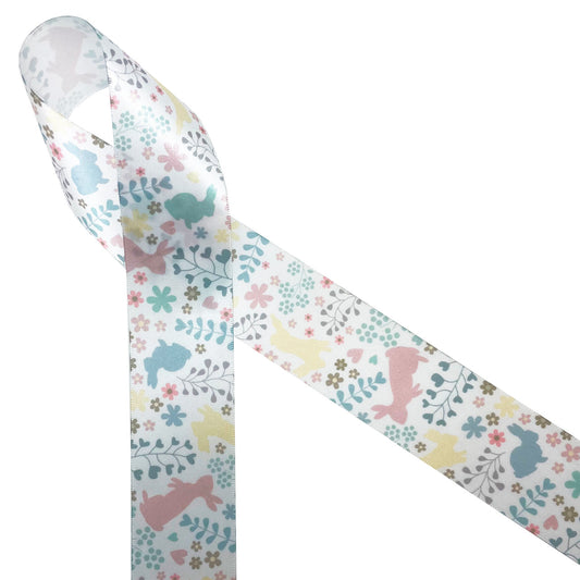 Easter ribbon pastel bunnies hopping in the flora in Spring shades of yellow, pink and blue printed on 7/8" and 1.5" white satin