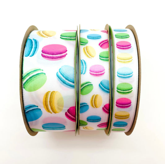 Macaroon ribbon cookies in pastel printed on 1.5" white satin