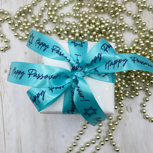 Passover Ribbon Happy Passover with the Star of David in dark blue printed on 7/8" turquoise satin