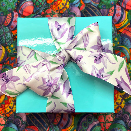 Lavender Lilly ribbon ideal for Spring printed on 1.5" white satin