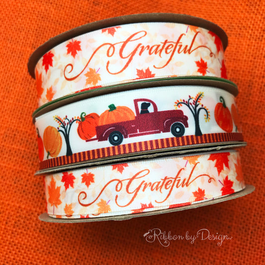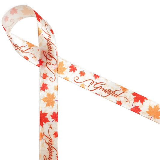 Thanksgiving Grateful ribbon with tossed Fall leaves in orange and yellow printed on 5/8" and 7/8" antique white satin