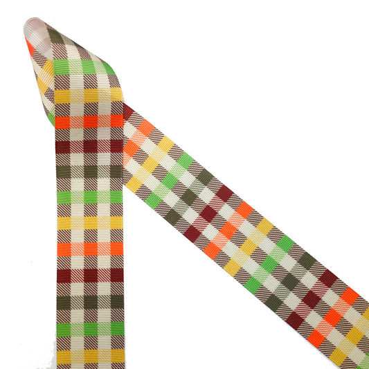 Fall plaid ribbon printed on 1.5" white grosgrain and satin