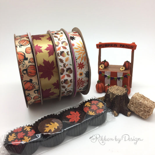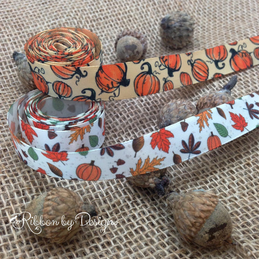 Fall leaves ribbon with Pumpkins printed on 5/8" and 7/8" Antique white Single Face Satin Ribbon