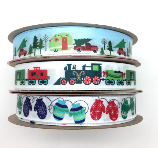 Christmas ribbon Bringing home the tree printed on 5/8" white satin