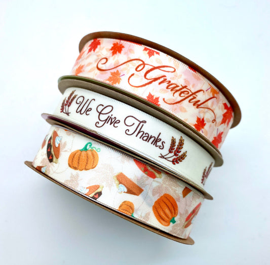 Celebrate fall festivities with Thanksgiving grosgrain and satin ribbon specially made for the occasion. We offer premium quality Happy Thanksgiving ribbon designed and made in the USA. Thanksgiving is a time to reflect on the true gifts in our lives. Family, friends, and sometimes even strangers come together to give thanks for all we have as a family and community.