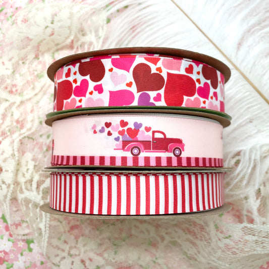 Valentine ribbon red truck with hearts printed on 7/8" pink satin
