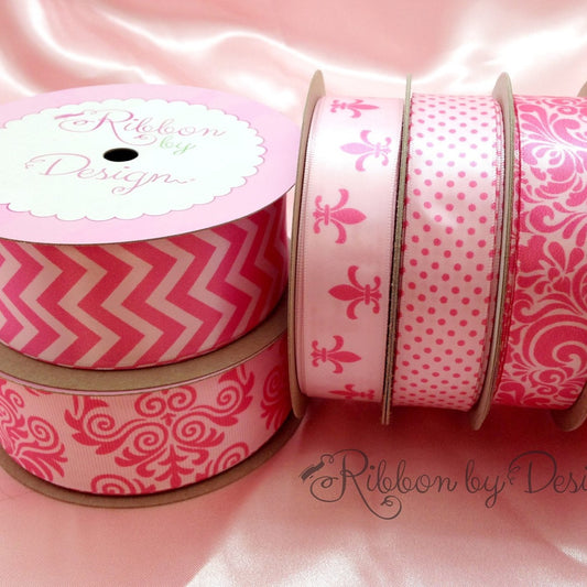 Fleur de Lis Ribbon in Medium Pink ink on Lt. Pink 7/8" Single Face Satin Ribbon,