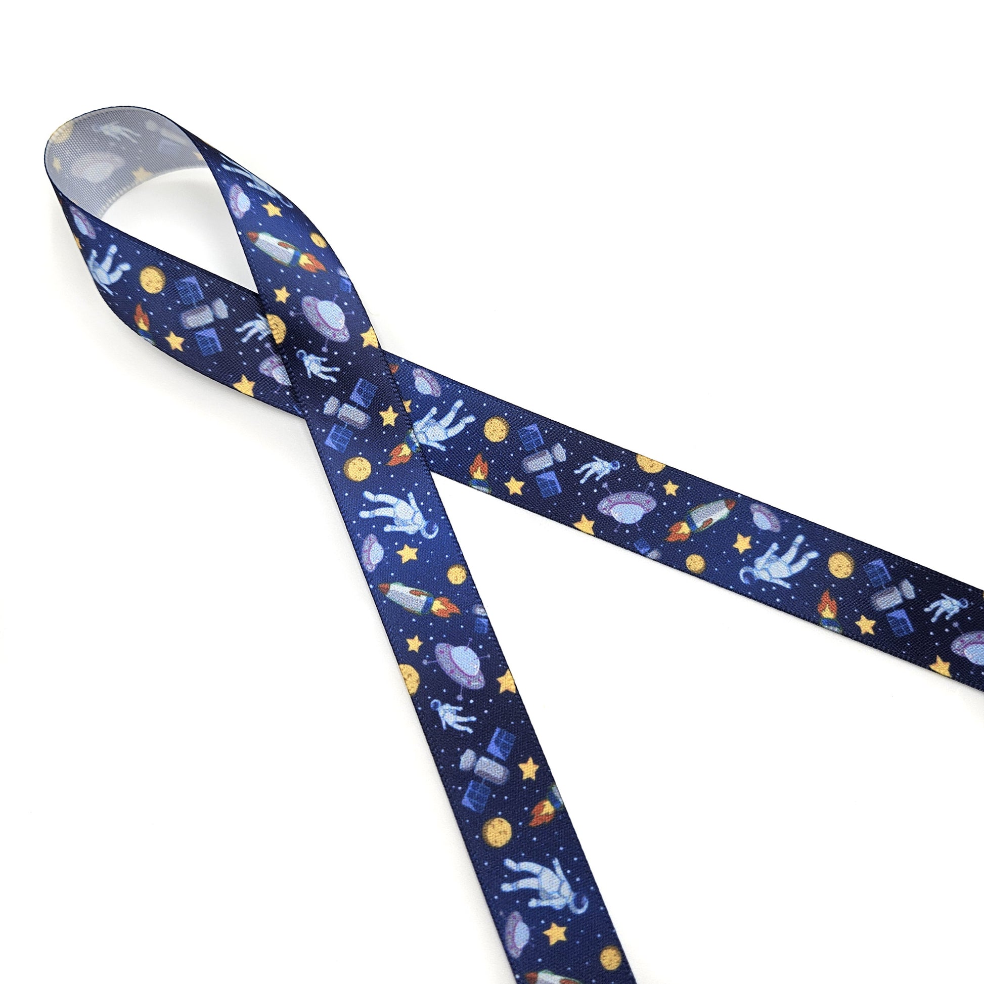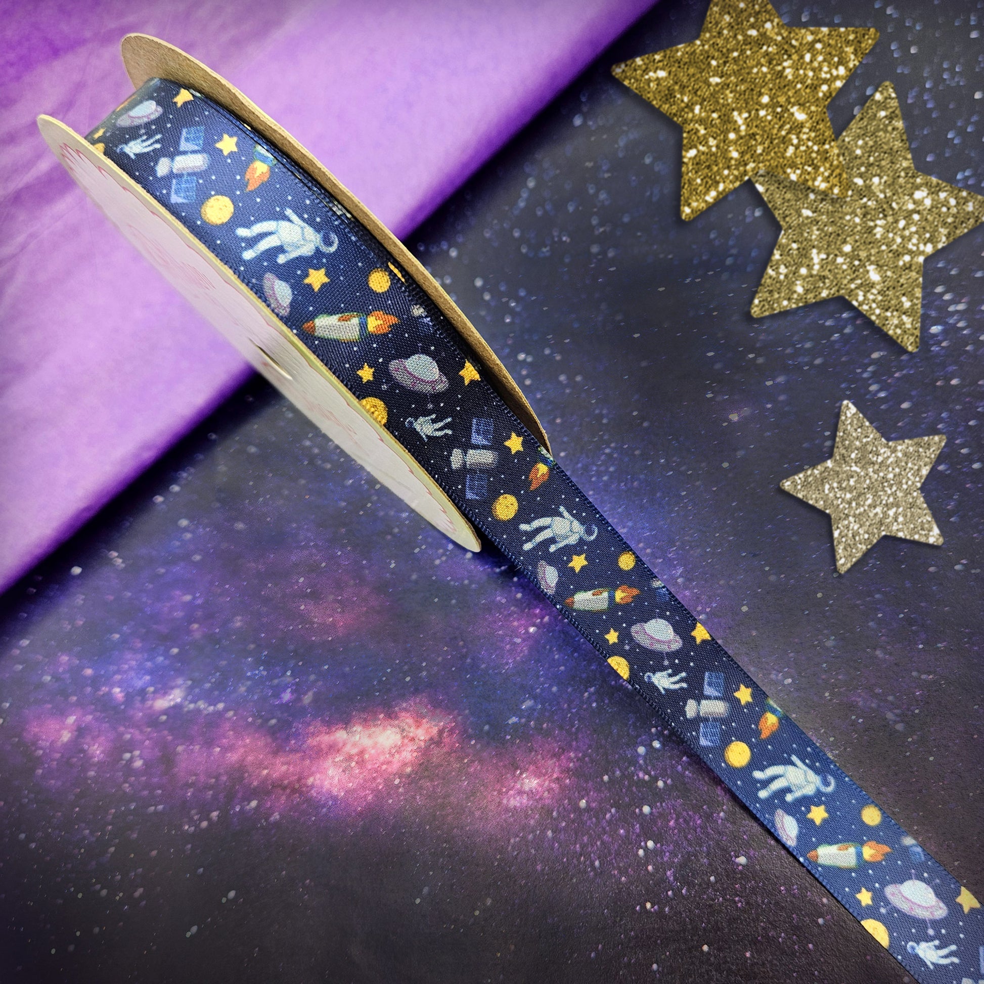 Blast off into celebration with this cosmic ribbon featuring adventurous astronauts, twinkling stars, colorful planets, and soaring rockets. Perfect for space-themed birthday parties, this vibrant 5/8" satin ribbon brings an out-of-this-world touch to gift wrapping, party favors, crafts, and sewing projects. Watch young explorers' eyes light up as they discover UFOs and celestial wonders woven into every inch. Ideal for boys who dream of the stars and parents planning an unforgettable galactic bash. Our ribbon is printed using dye sublimation technology, and will not fade, peel or chip. It is washable, can be ironed and re-used. Designed and printed in the USA