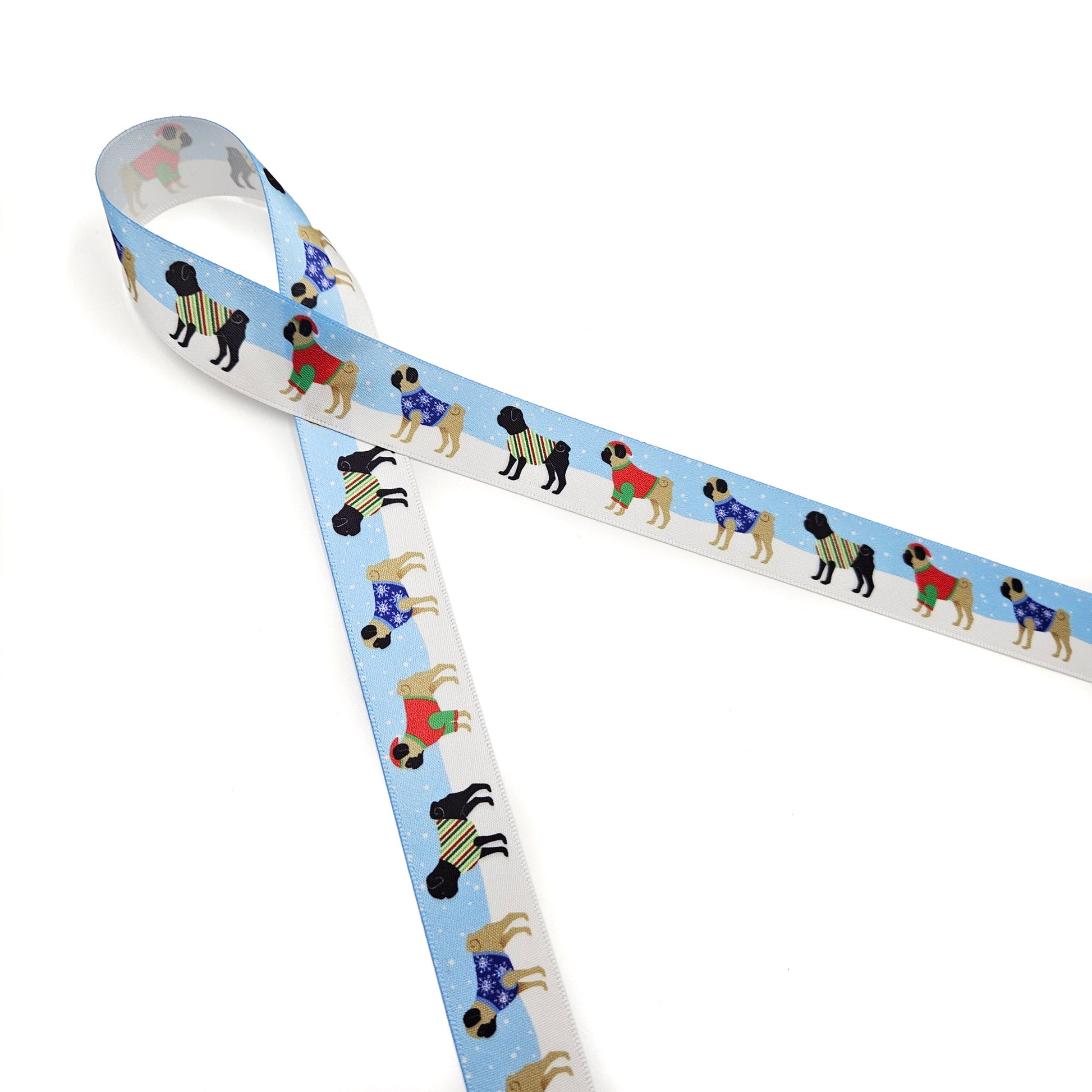 Dog ribbon for pet lovers features Pugs in Holiday sweaters! Pugs line up dressed in Holiday sweaters of red and green printed on 5/8" and 7/8" white single face satin. This adorable ribbon is ideal for gift wrap, gift baskets, crafts, quilting and sewing projects. Use this ribbon for decorating your pet's holiday tree and wreath! Our ribbon is printed using dye sublimation technology, and will not fade, peel or chip. It is washable, can be ironed and re-used. Designed and printed in the USA
