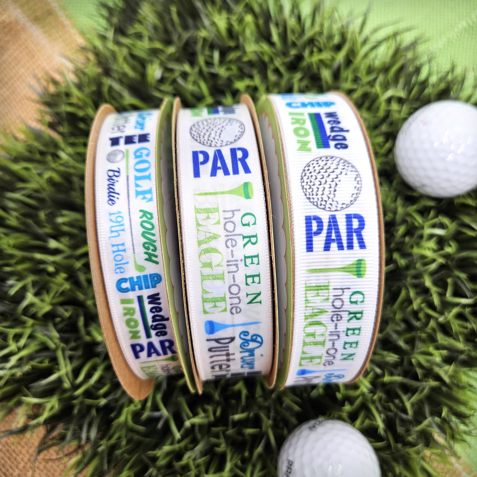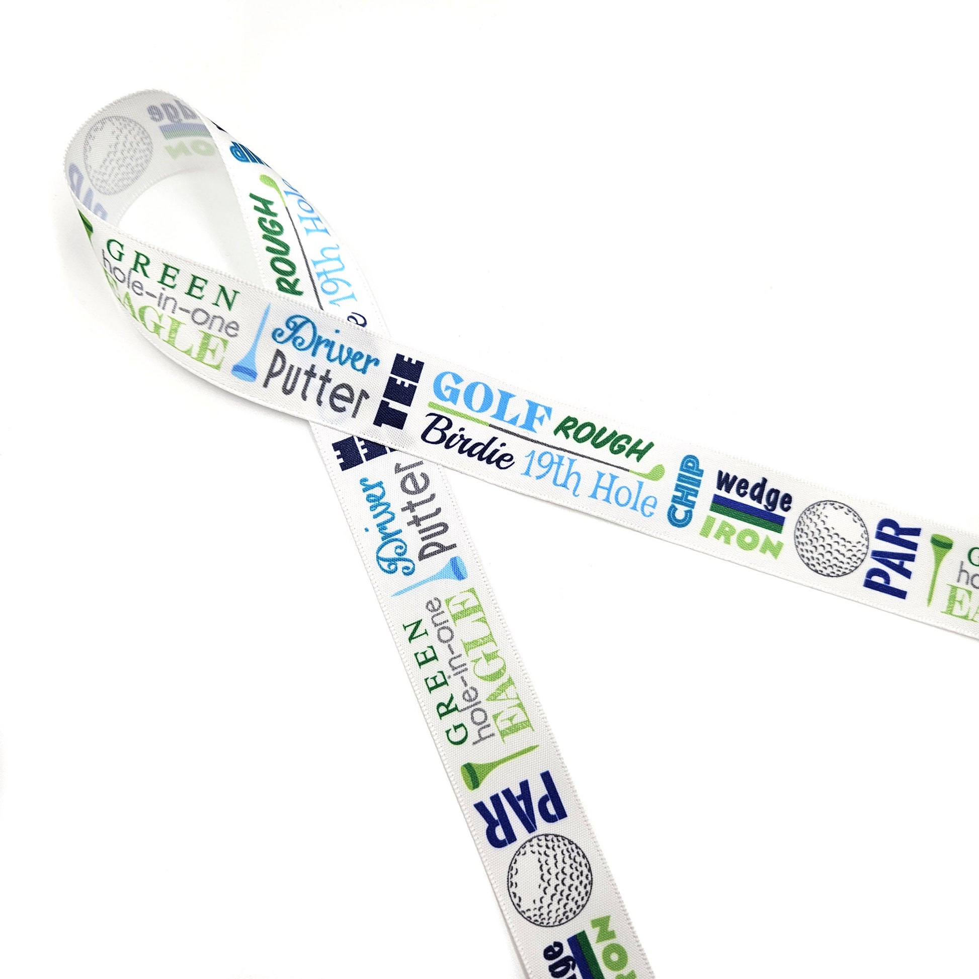 Tee up your décor with this charming golf word block ribbon! Featuring playful golf-themed typography in vibrant blue and green, this versatile ribbon brings sporty flair to any project. Available in both 5/8" and 7/8" satin and grosgrain options with crisp white backgrounds, it's perfect for gift wrapping, crafts, scrapbooking, or adding a hole-in-one touch to party decorations. Whether you're a golf enthusiast or just love the game's aesthetic, this ribbon scores big on style and personality. Our ribbon is printed using dye sublimation technology, and will not fade, peel or chip. It is washable, can be ironed and re-used. Designed and printed in the USA