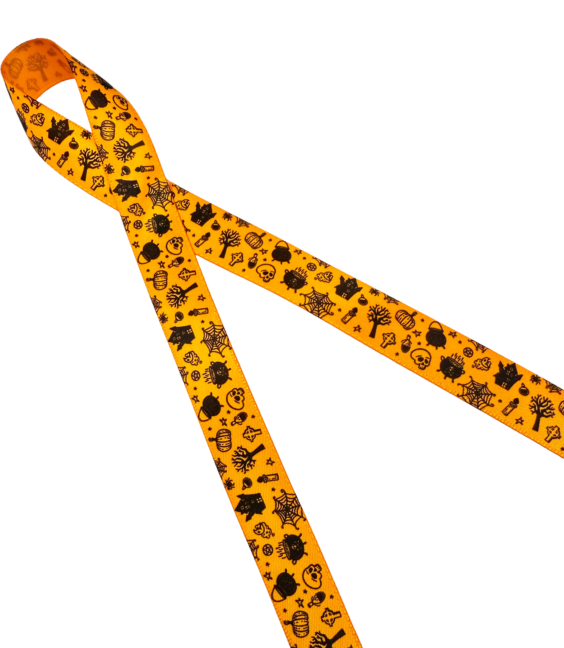 Halloween ribbon with elements of the season tossed in black on 5/8" and 7/8" tangerine single face satin ribbon is a festive look for any Halloween celebration. This fun ribbon features skulls, cauldrons, haunted houses, potion bottles, spider webs pumpkins and more! Use this ribbon for party favors, party decor, trick or treat bags, cookies and candy gifts. This is an ideal ribbon for costumes, Halloween crafts, sewing and quilting projects.